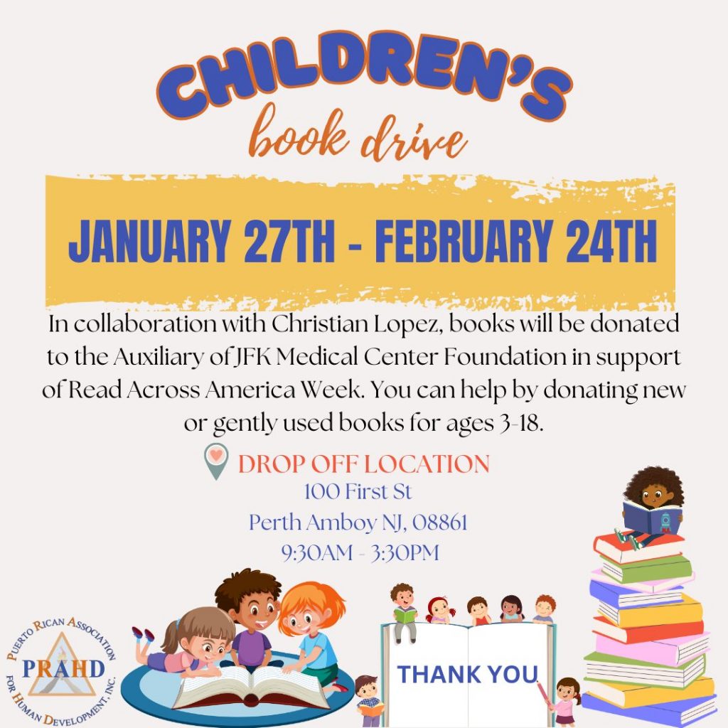 PRAHD, in collaboration with Christian Lopez, is excited to host our Children’s Book Drive! This initiative supports the Auxiliary of JFK Medical Center Foundation’s celebration of Read Across America Week, bringing books and joy to young readers.